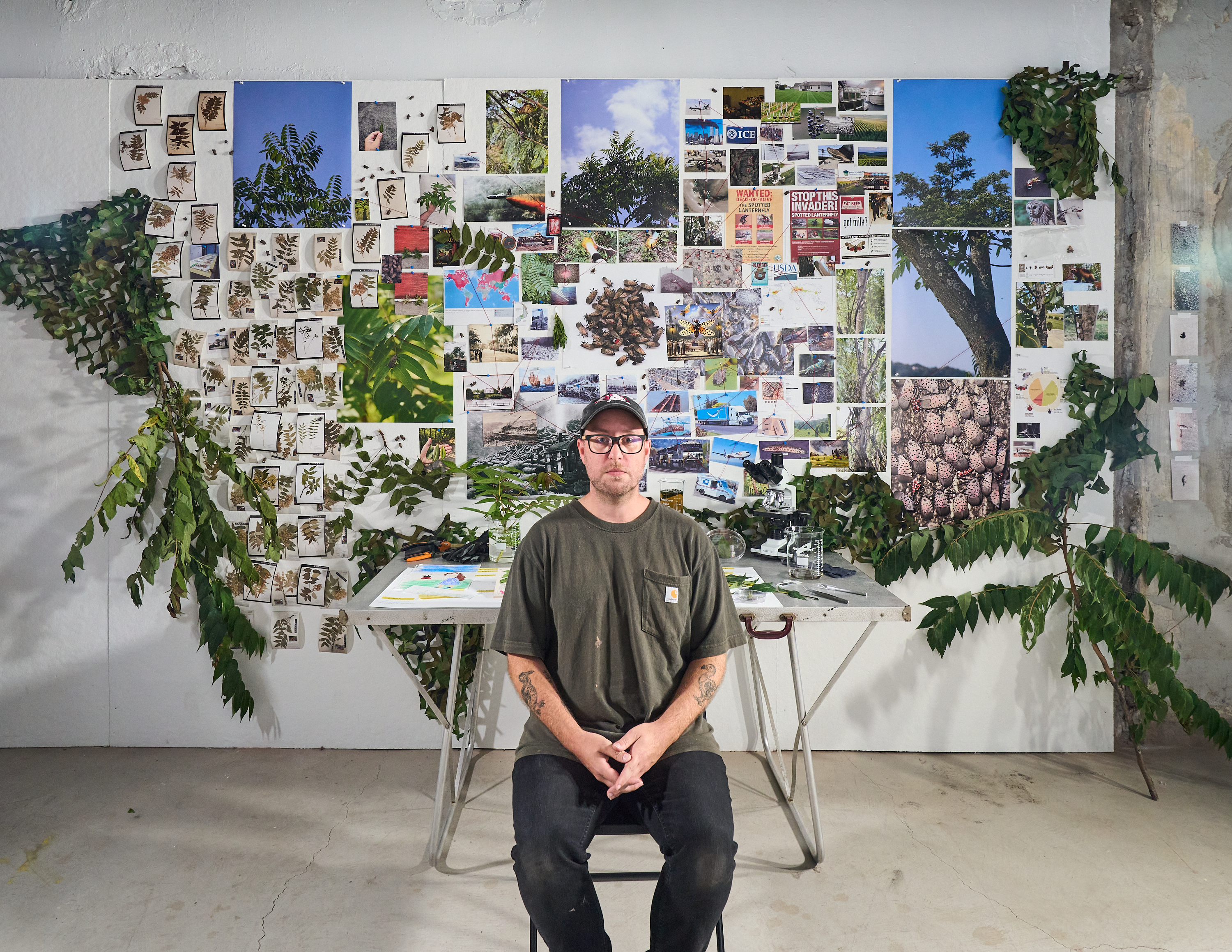 Artist in front of Tree of Heaven and Spotted Lanternfly relationship-sprawl across time, Pennsylvania and beyond, 2024.