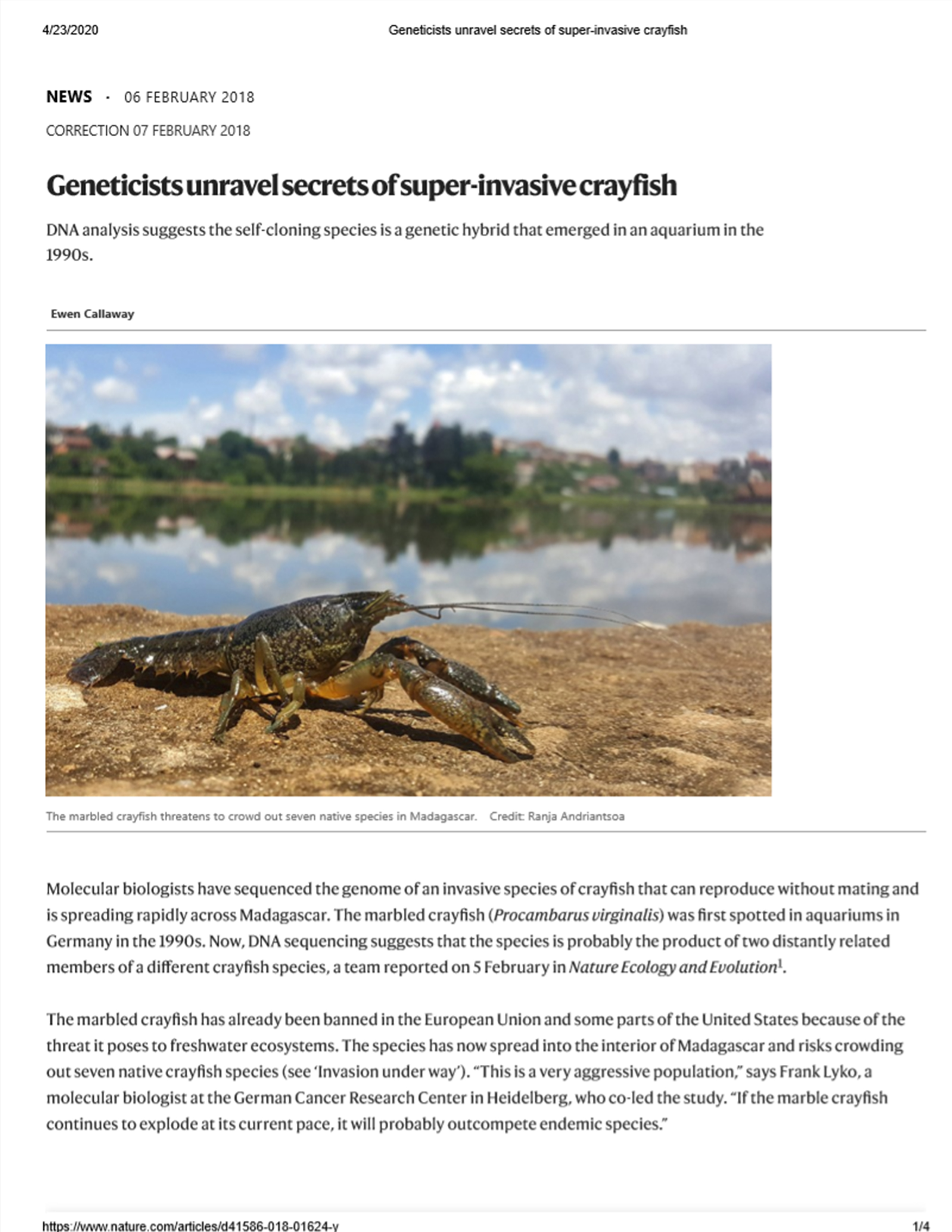 Super-invasive crayfish article in Nature, February, 2018 (8).