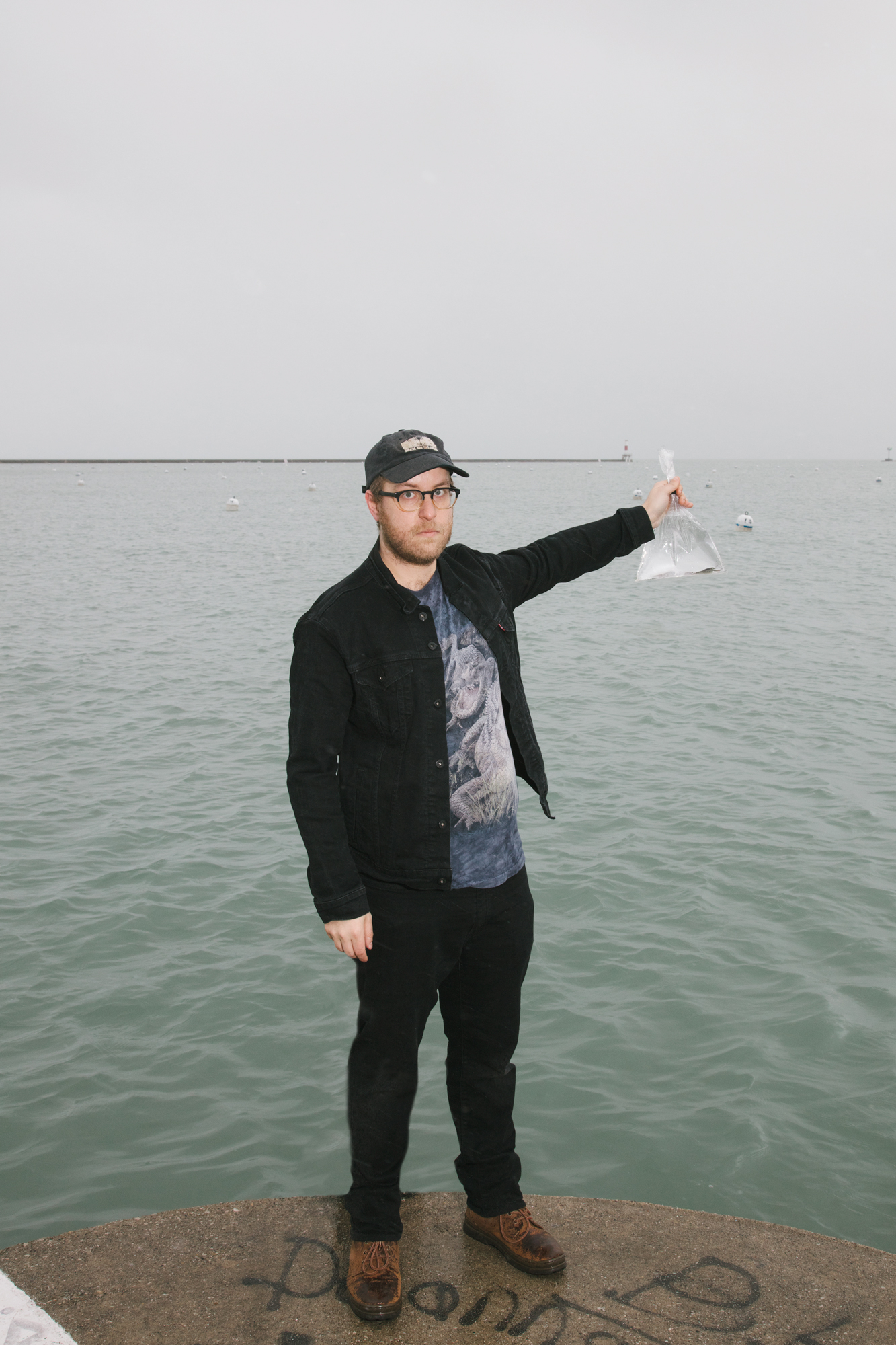 Artist with Marbled Crayfish in plastic bag at the lakeshore in Chicago, Il, 2018 (5).